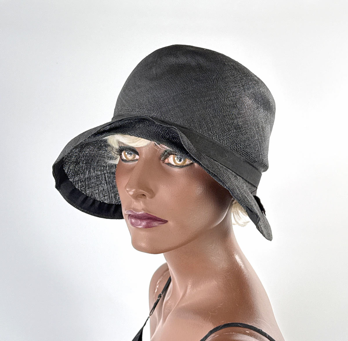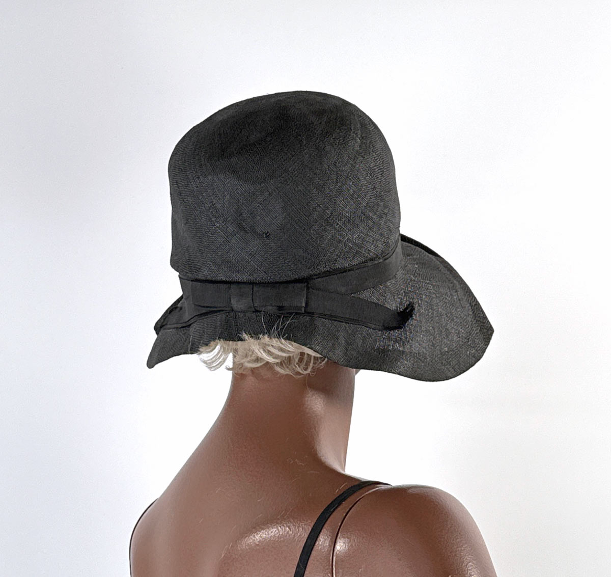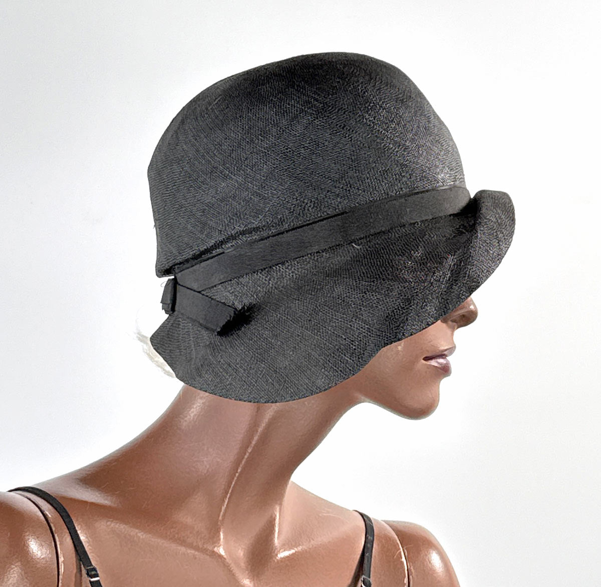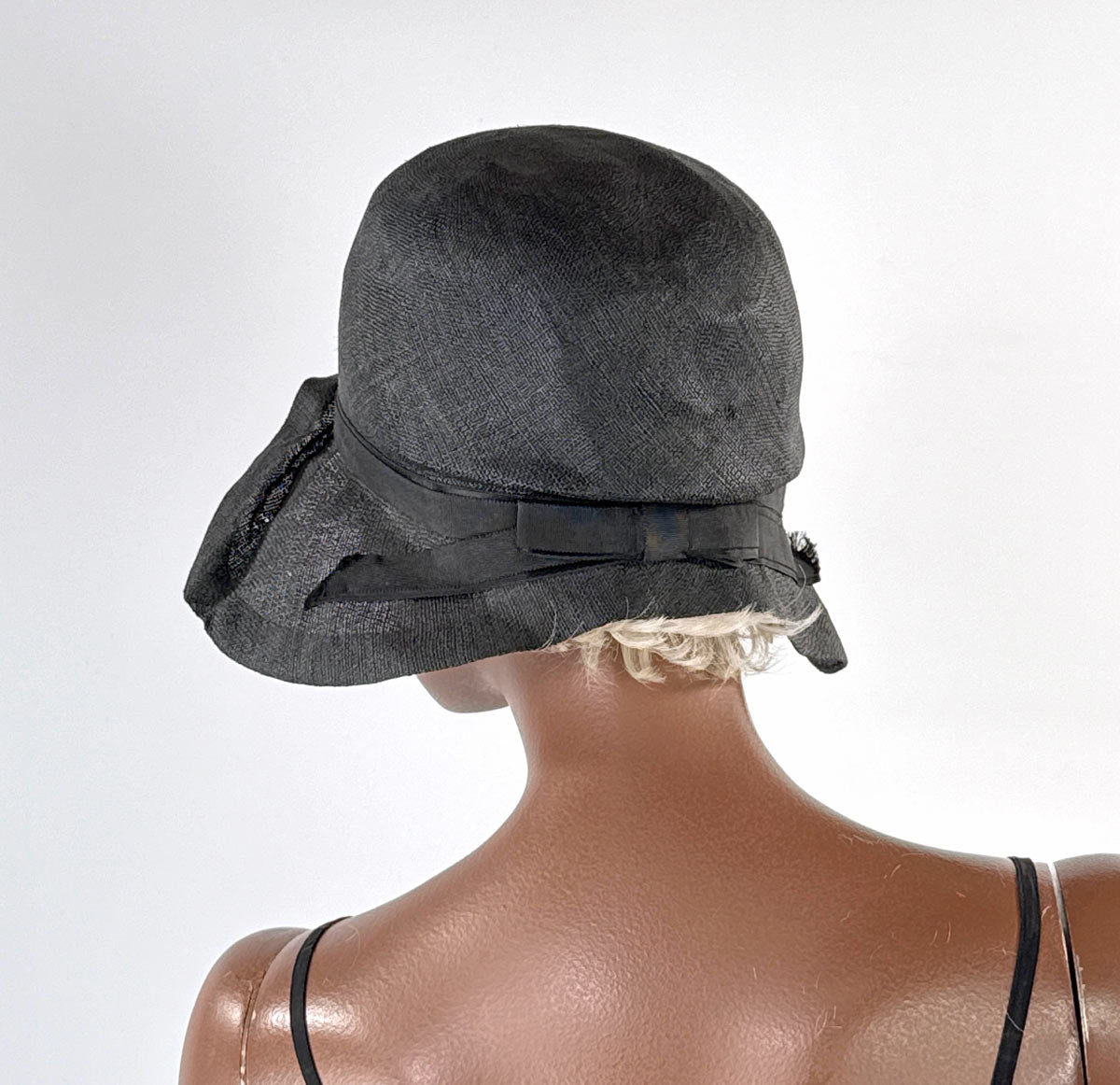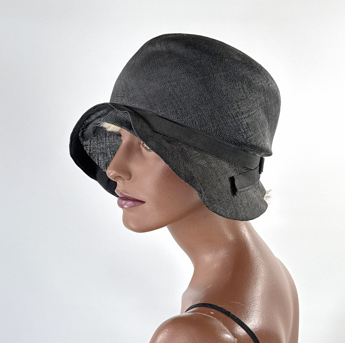 Vintage 20s Hat Deep Cloche Brim Black Straw M/L Beresford VFG