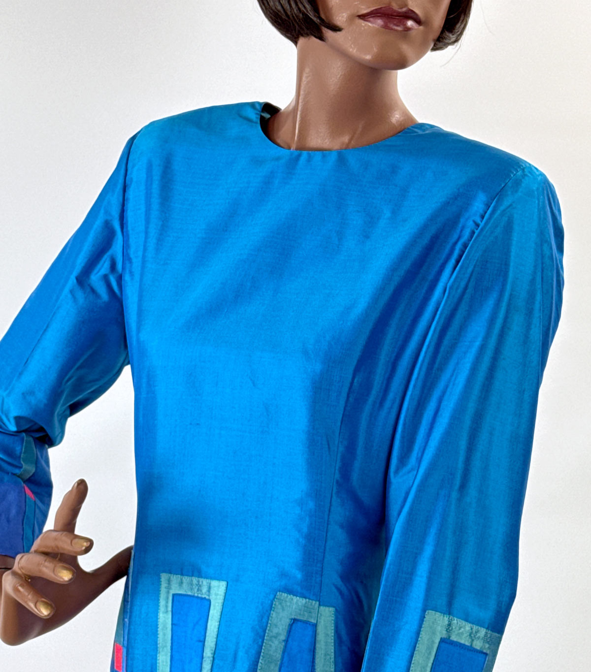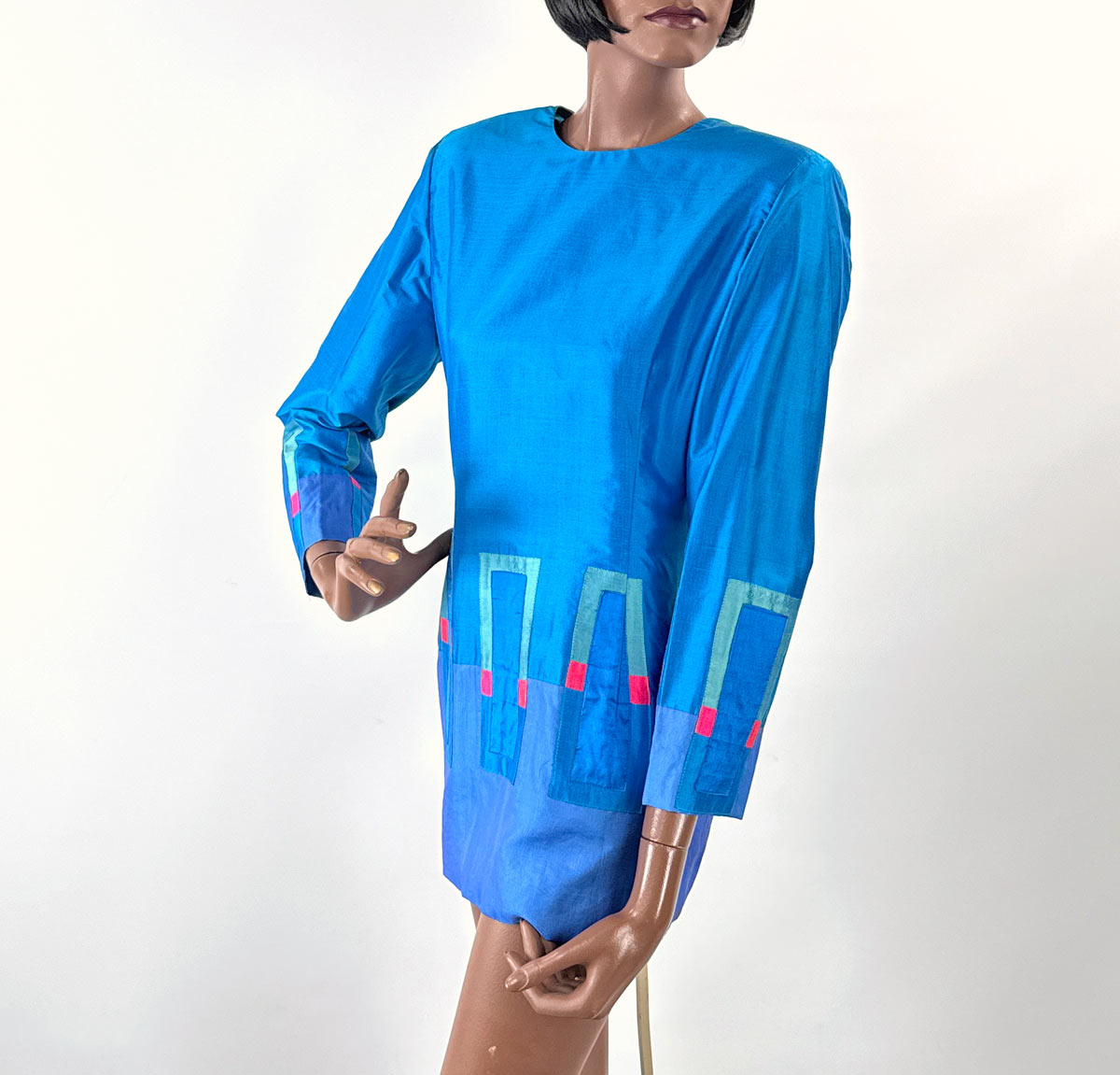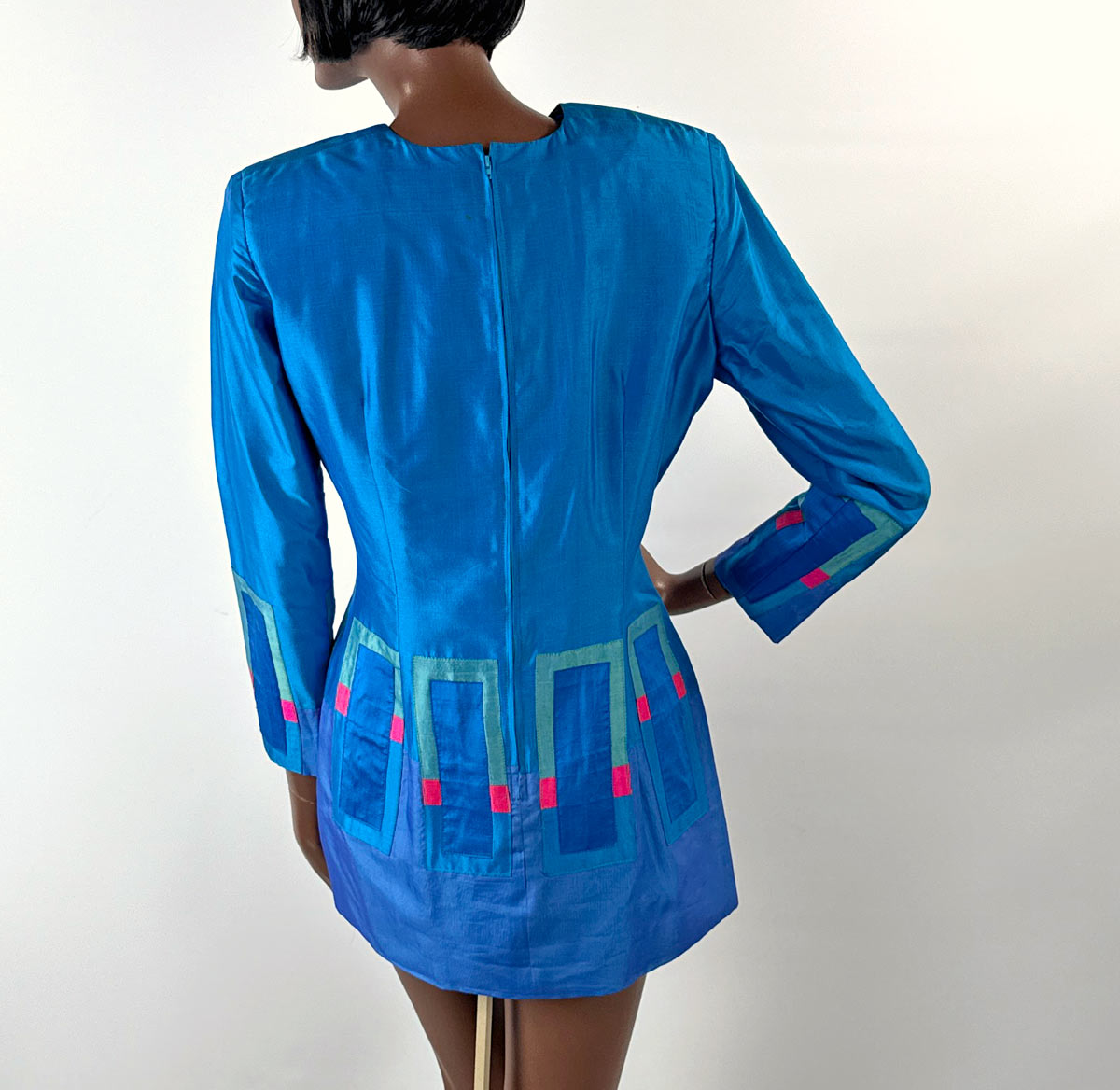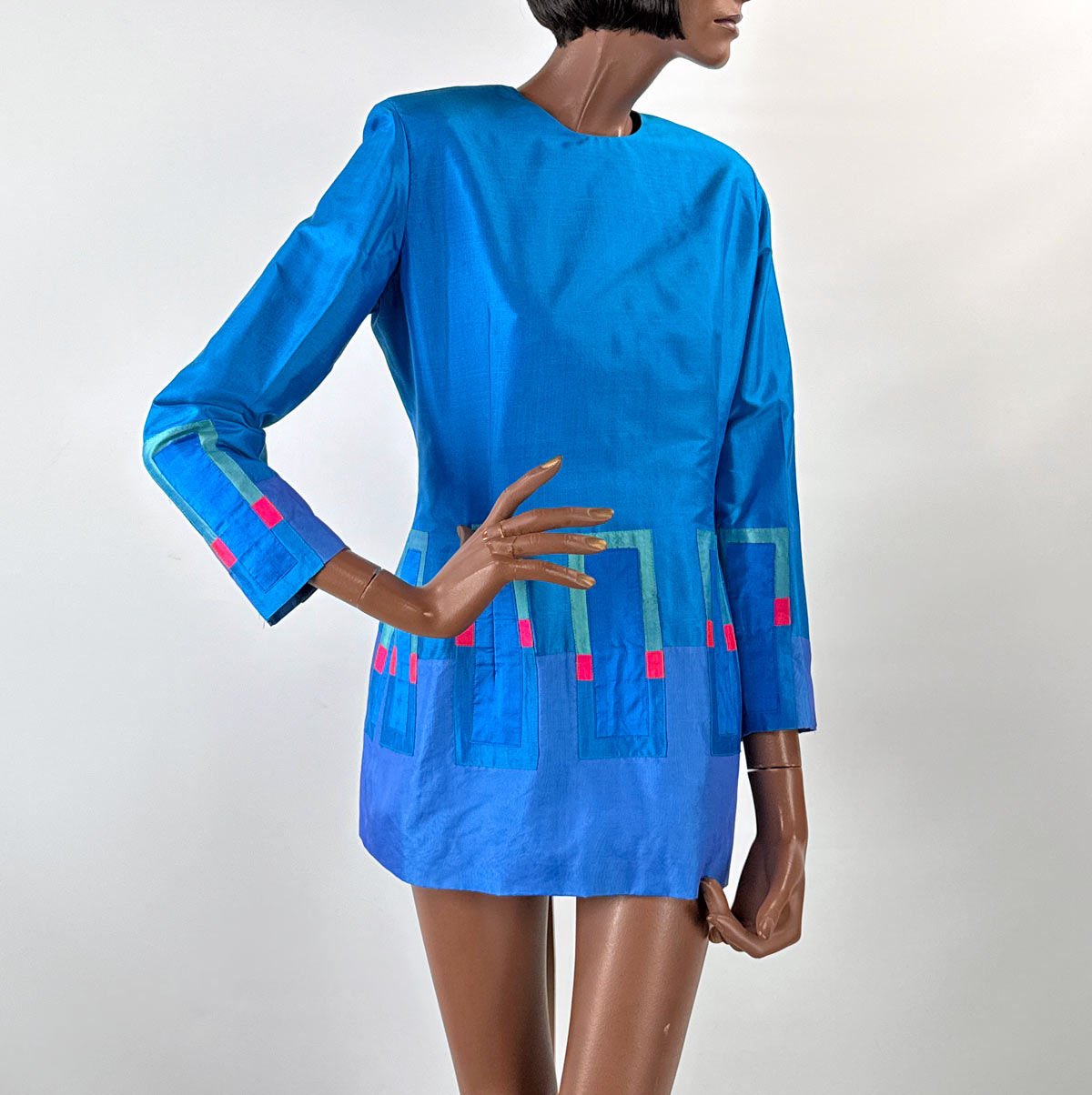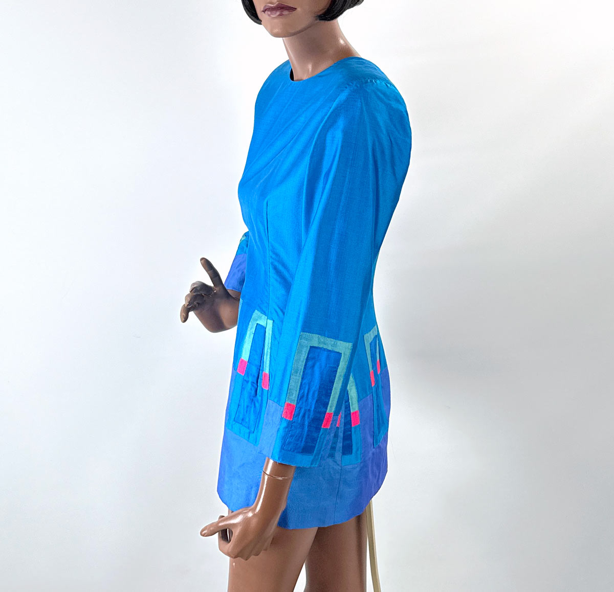 80s Turquoise Mini Dress Geometric Op Art Jewel Toned Tunic VFG