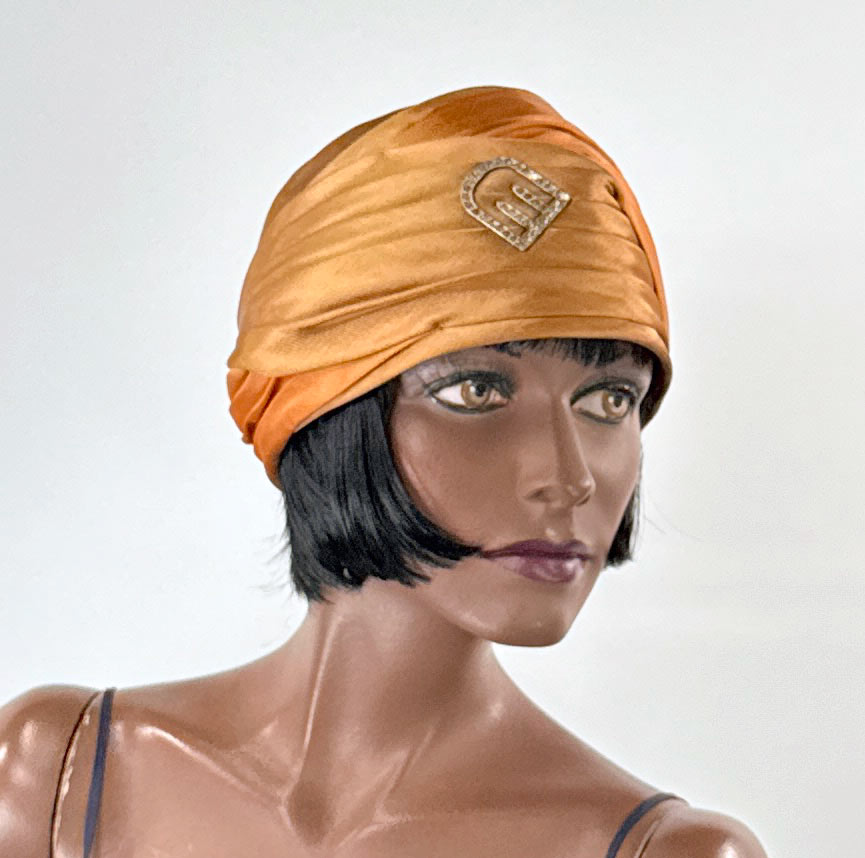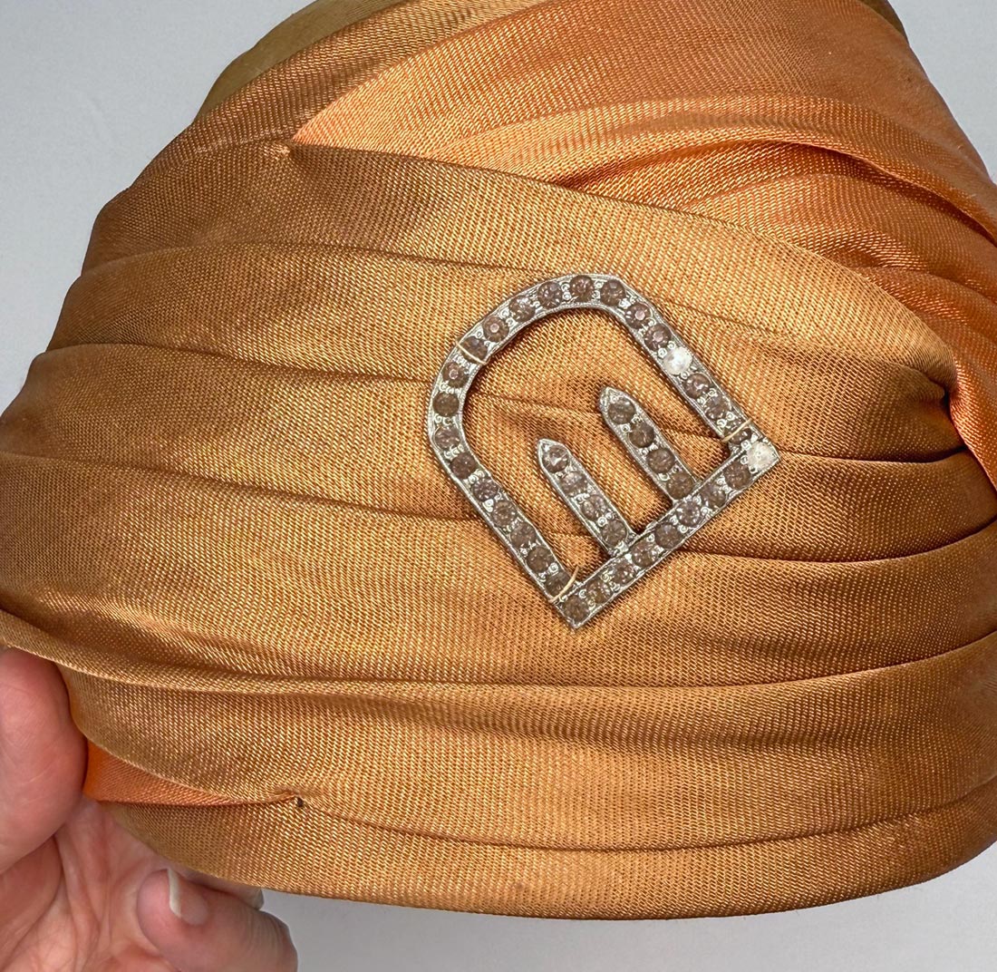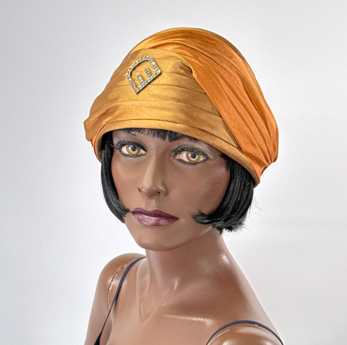 20s Vintage Cloche Draped Turban Style Orange & Gold Rhinestone Clip Hersh's VFG