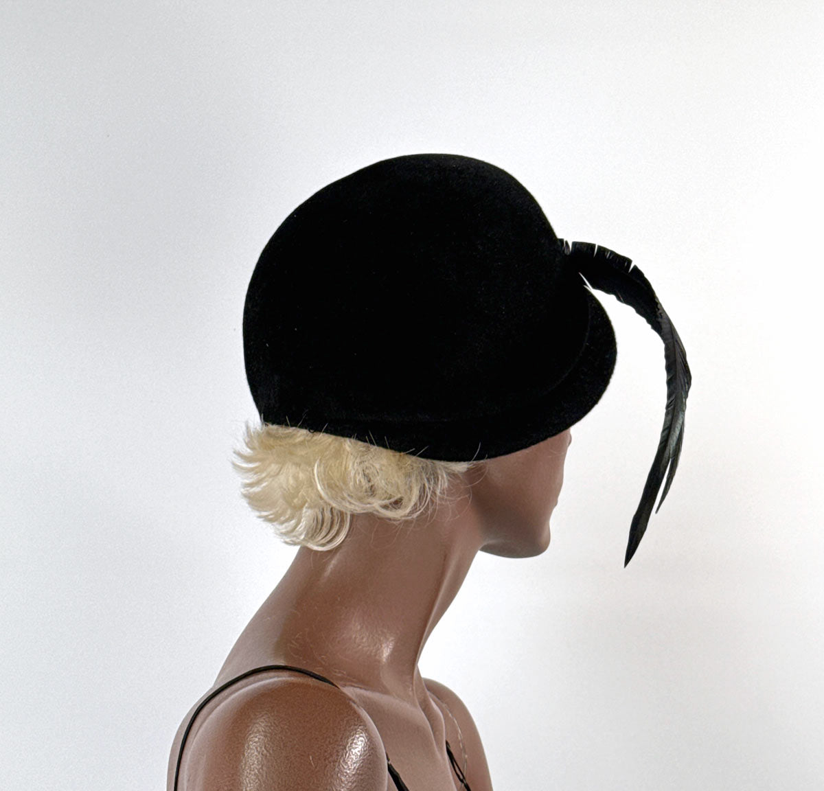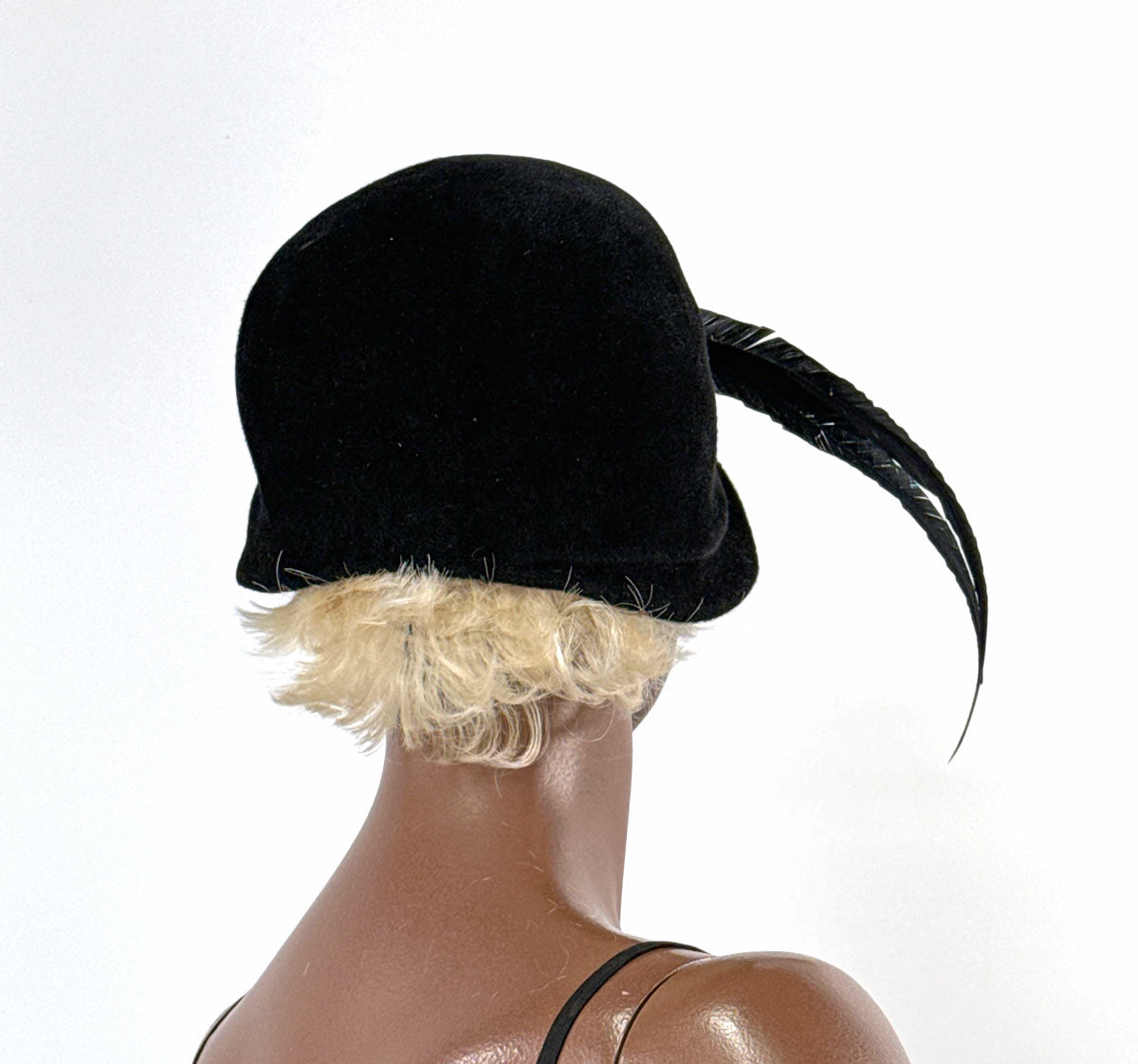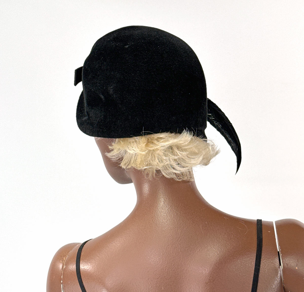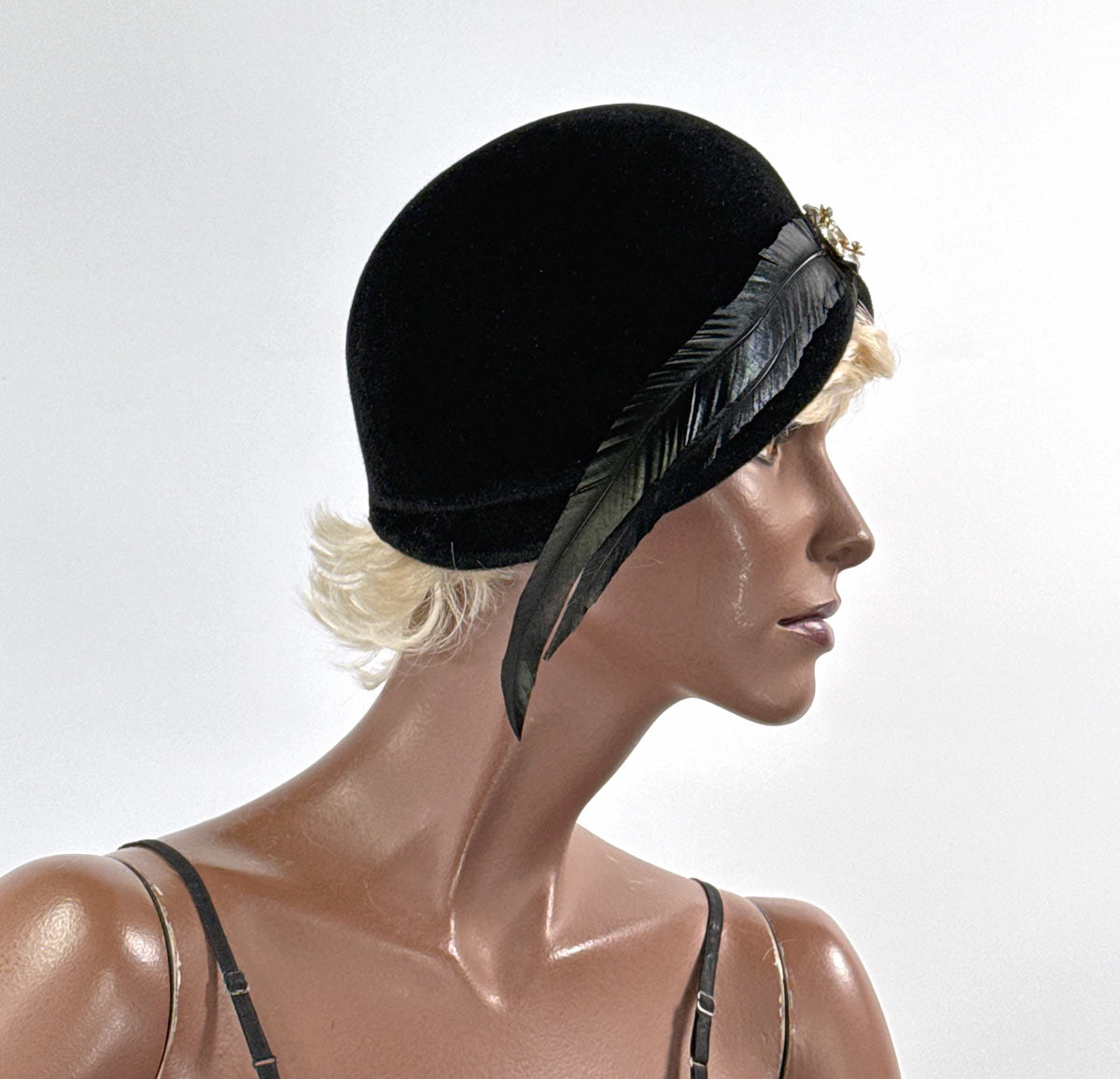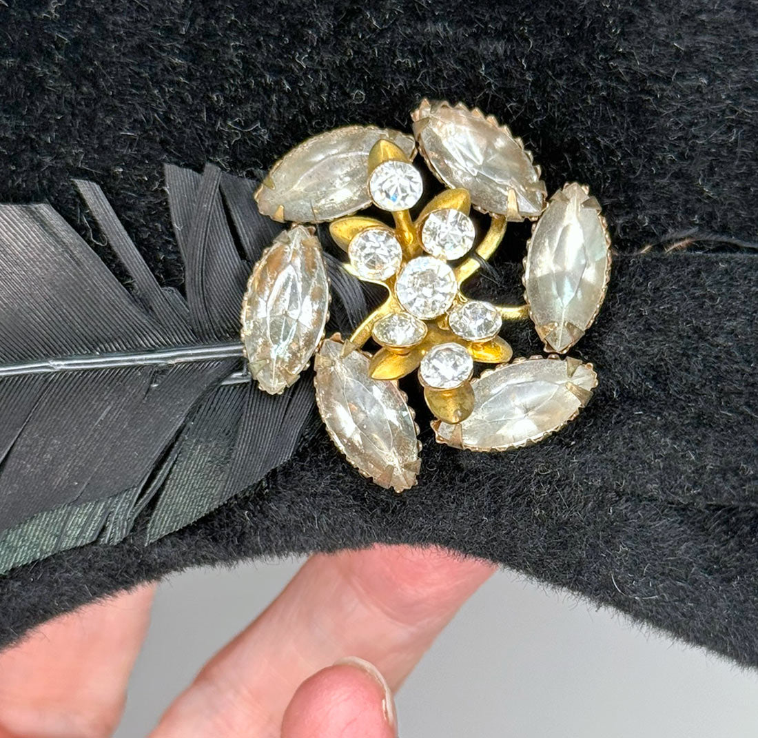 60s Vintage Cloche Hat 20s Inspired Dramatic Feather & Rhinestones Joseph Magnin VFG
