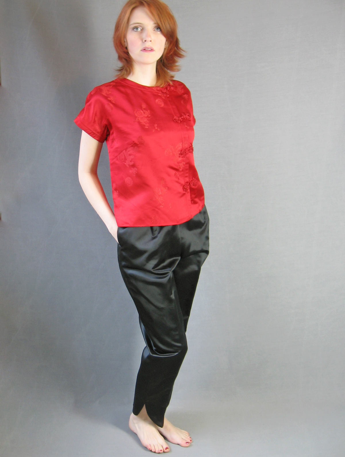 60s Asian Hostess Pajamas Outfit Women's Qipao Top Pants Vintage Satin M/L VFG